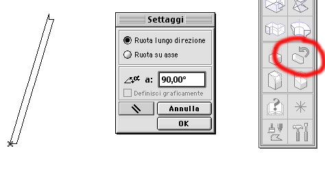 Impostiamo la direzione di rotazione (come vedete dall’immagine sopra, con la forzatura del cursore io indico la direzione verticale e la rotazione di 90° avverrà rispetto a questo direzione, il verso, in alto o in basso, mi determina come sarà girato l’elemento. Potete fare delle prove per capire il meccanismo) e a questo punto clicchiamo con il mouse per confermare e ottenere la rotazione.