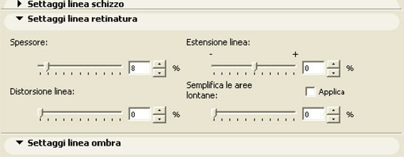 I settaggi comprendono inoltre attivazione di ombre, retini, e di tutti parametri del tratto. È possibile tutta via cambiare lo stile di linea a proprio piacimento, mantenendo le impostazioni dello stile di schizzo, in questo modo si hanno infinite possibilità di personalere gli effetti grafici.