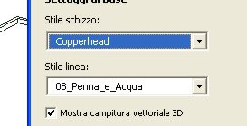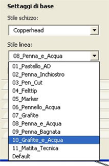 Ognuna di queste voci corrisponde ad uno stile grafico diverso che avrà l'immagine finale , come accennato si passa dagli stili tecnici a quelli più artistici , dall'effetto matita a quello acquerellato. Selezionando uno stile (esempio copper head)si vedrà che nel secondo menu a tendina corrisponde un tipo di tratto ben specifico, infatti ogni stile è reimpostato con suo tipo di tratto che ha delle caratteristiche ben definite, allo stile copper head corrisponde il tipo di tratto 08_penna e acqua.