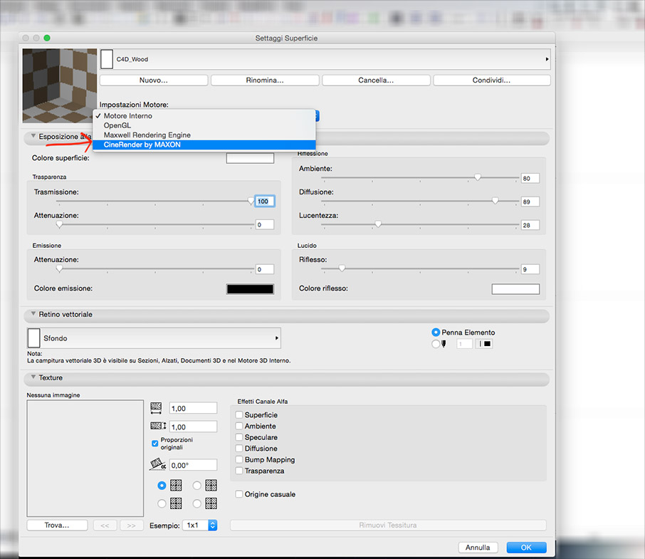 Il materiale di Cinema4D è perfettamente caricato nei settaggi del materiale creato in ArchiCAD