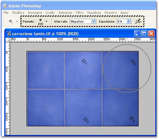 Colloco i punti campione in varie posizioni; per semplicità di lettura, li distribuisco in modo analogo a come compaiono nella palette: il primo in alto a sinistra, il secondo alla sua destra, ecc. Cliccando sul piccolo contagocce, nella palette Info, scelgo la modalità di misura "Scala di grigio", che presumo offra la migliore informazione sulla luminosità. Notate che nella barra in alto, nel menu Campione, ho scelto l'opzione "Media 5x5", perché sarebbe del tutto inutile avere la misurazione effettuata su un singolo pixel arbitrario. Ora, usando gli strumenti Scherma (per aumentare la luminosità) e Brucia (per ridurla), schiarisco o scurisco leggermente le varie aree dell'immagine, finché l'indicazione fornita dai campioni risulta omogenea. È importante usare un pennello molto grande e sfumato, ed applicarlo con passate successive molto "leggere", per evitare segni antiestetici.