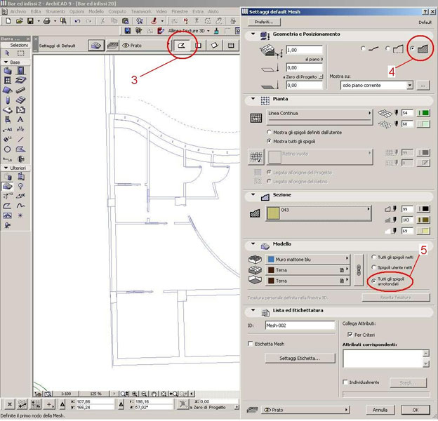 Selezioniamo lo strumento mesh e nella modalità "Metodo Geometria Mesh" (3) e nella finestra dei settaggi dobbiamo spuntare l'opzione per creare corpi solidi con la mesh (4) e la modalità "tutti gli spigoli arrotondati" (5)