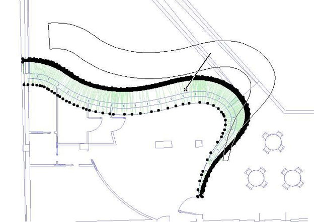 La linea di attacco a terra del muro (1) e la linea tratteggiata (2) di proiezione del coronamento del nostro muro curvo distano di circa 1,50 metri e man mano che ci si avvicina alla porta d’ingresso convergono facendo diminuire l’inclinazione del muro.