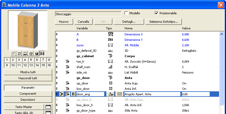 Le operazioni da compiere nel corso dell'animazione possono essere le più disparate. Nel nostro esempio abbiamo modificato semplicemente un'altezza, ma la gamma di istruzioni utilizzabili è virtualmente infinita, e limitata solo dalla fantasia. C'è chi ha realizzato superfici con onde mobili, per simulare un mare agitato, chi ha fatto delle bandiere che garriscono al vento... un altro esempio potrebbero essere quello di un semaforo funzionante, con le luci che si alternano a tempo, o un'insegna con una scritta scorrevole, come quella che potete scaricare in fondo a questa pagina (vers. AC8). Per terminare vediamo rapidamente come aggiungere il movimento ad un oggetto di libreria esistente senza modificarlo! Basta creare un nuovo oggetto che chiama quello da animare, inserendo le istruzioni necessarie. Prendiamo per esempio il "Mobile colonna 2 ante" da 1. Libreria di base/1.1 Arredi/Mobili Cucina. Voglio animare l'apertura delle ante, quindi la prima cosa da fare è aprire l'oggetto, per vedere il nome della variabile da "pilotare". Scorrendo l'elenco dei parametri si vede che la variabile che controlla l'apertura delle ante si chiama "door_ang".