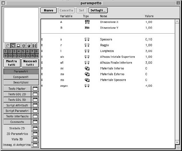 Nella Finestra di dialogo principale di creazione dell'oggetto avremo opportunamente inserito le variabili ed i nomi, ad esempio come nella figura qui sopra. Se richiamiamo una vista 3D noteremo che esso si presenta come "coricato": l'oggetto infatti nasce sul piano xy e ruota attorno ad un asse che è parallelo all'asse y e distante r da esso. Chi frequenta, anche poco, il GDL sa che è sufficiente inserire l'istruzione rotx 90 prima del testo sopra scritto per rimettere in piedi l'elemento. Possiamo aggiungere anche un parametro relativo alla risoluzione: chiameremo la variabile ri nel testo e scriveremo Risoluzione (per le specifiche di utilizzo della direttiva RESOL si rimanda alla pagina 143 del Manuale GDL della versione 6.0) nel campo destinato al Nome nella Finestra di dialogo principale dell'oggetto.