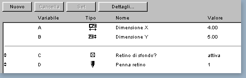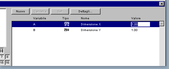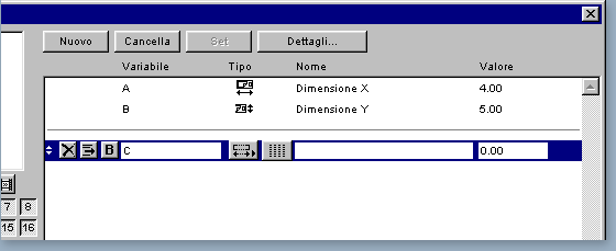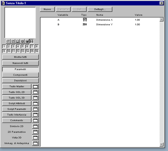 Il disegno è pronto, ora bisogna solo farlo funzionare. Per cominciare occorre preparare un parametro aggiuntivo, che possa dare all'utente la possibilità di scegliere. Ogni oggetto infatti "nasce" con due soli parametri, Dimensione X e Dimensione Y. Questi li fornisce gentilmente ArchiCAD... tutti gli altri deve aggiungerli, se necessario, chi crea l'oggetto. Comunque la cosa è semplicissima. Anche questa operazione, come molte altre, si risolve con un click. Basta farlo sul pulsante Nuovo e alle prime due righe, contraddistinte nella colonna Variabile dalle lettere A e B, ne verrà aggiunta una nuova, contrassegnata dalla lettera C.