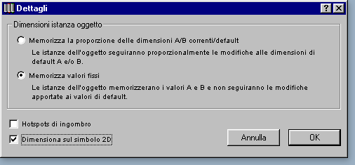 Questo farà comparire una finestra di dialogo in cui si trova l'opzione Dimensiona sul simbolo 2D. Se ne trova anche un'altra che permette, volendo, di riattivare gli hotspot di ingombro, che andranno a sommarsi a quelli messi manualmente.