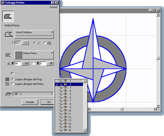 Se la finestra principale non mostra i campi Lunghezza e Larghezza, né il pulsante Dettagli, vuol dire che è attiva un'altra schermata. Per tornare a questa cliccate sul pulsante Parametri, sulla sinistra. Registrate nuovamente l'oggetto e provatelo... ora dovrebbe funzionare tutto perfettamente. Tenete presenti due cose: 1. L'ingombro calcolato per il simbolo tiene conto di tutti i Frammenti, anche quelli nascosti; 2. I Frammenti saranno sempre tutti visibili, utilizzando l'oggetto nelle finestre di Pianta e Sezione/Alzato. La condizione di visibilità on/off è relativa solo alla fase di editazione dell'oggetto. Se questo secondo punto vi crea dei disagi, e vorreste poter decidere in ogni momento quali parti del disegno rendere visibili e quali no, continuate a leggere, e vedrete che non è dificile. Prima di tutto verificate che il disegno fin qui eseguito sia tutto realizzato sul Frammento n.1 (dovrebbe essere quello predefinito per tutti gli strumenti). Ora aggiungiamo qualche elemento sul Frammento 2, ad esempio un retino pieno di sfondo nella fascia circolare.